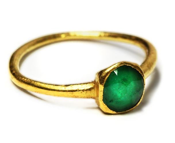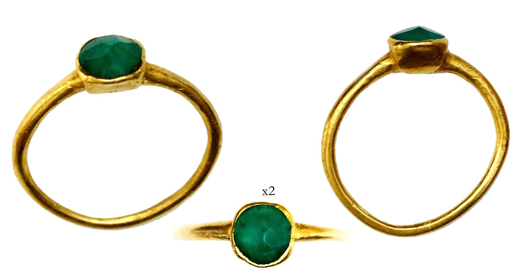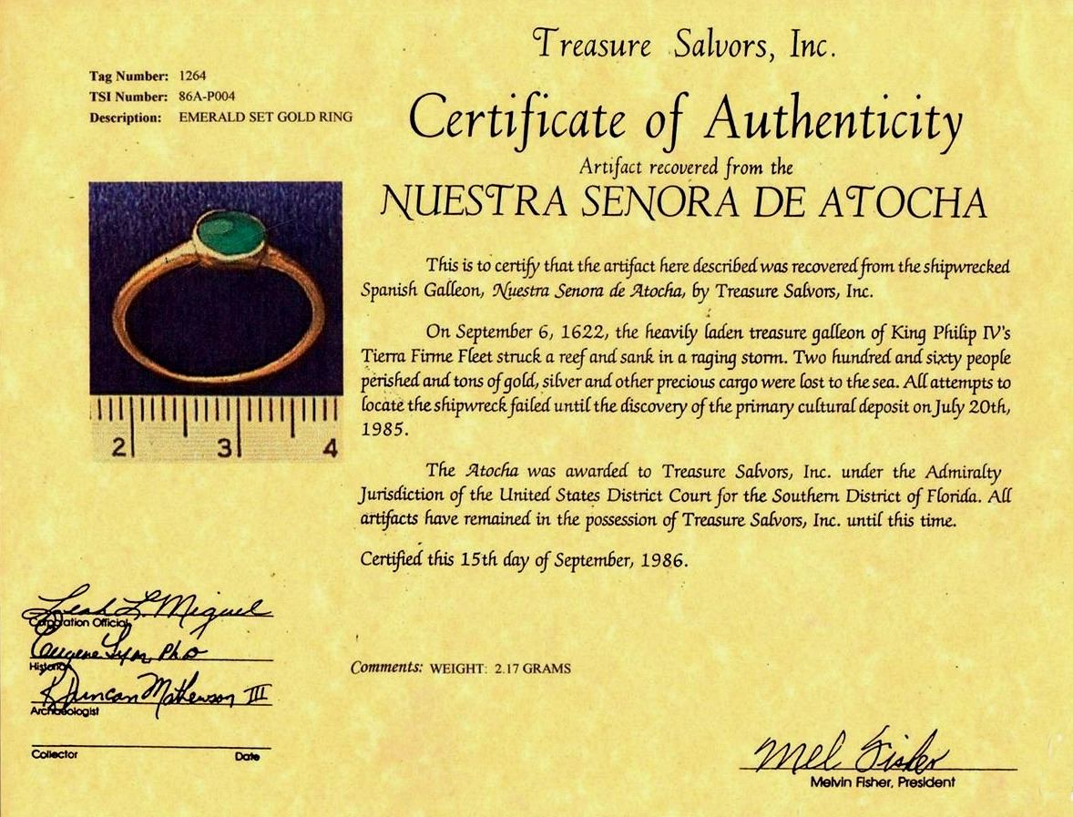 Gold-and-emerald ring, approx. 1 carat, size 4, from the Atocha (1622). 2.1 grams. A somewhat plain, gold-wire ring (slightly misshapen but wearable) but with nice, round emerald of attractive milky-green color, good clarity, with asymmetric facets on top (almost cabochon). From the Atocha (1622), with Fisher photo-certificate #86A-P004 and appraisal certificate for $25,000, pedigreed to our Auction #12 (lot #1780).
