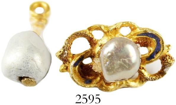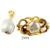 Gold-and-pearl pendant and dress-mount, Spanish colonial (1500s-1600s). 1.8 grams, each about 1/2". Very white but irregularly shaped pearls threaded onto posts in high-grade gold settings, one with loop at one end (for a pendant or earring) and the other with loop in back and with wire design on sides. From a colonial site in the southern Caribbean.