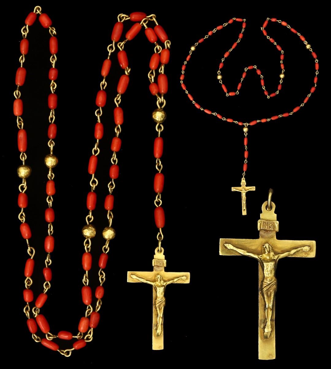 Gold and red-coral rosary, complete and intact. 60.09 grams total, 19-1/2" long. A most impressive religious jewel in an excellent state of preservation, with all the coral and gold beads intact, very similar to the other specimens we have sold (same beach find). The 53 oval, red-coral beads represent five "decades" around the neck and three beads down to the cross, separated by 5 gold beads (known as "paternosters"), the crucifix at bottom measuring 2" and consisting of a flat cross surmounted with separately cast Jesus figure and INRI on plaque at top (lacking the skull and crossbones of Golgotha at bottom, as made), its backside plain, with integrated loop and jump-ring at top. Generally very rare and expensive today, red coral was a popular constituent of rosaries as it was believed to protect against magic spells, going back to Greek mythology that gave red coral's origin as "the spurts of blood that gushed forth when Medusa's head was cut off by Perseus." With Sinclair photo-certificate. Recovered from: Spanish 1715 Fleet, east coast of Florida