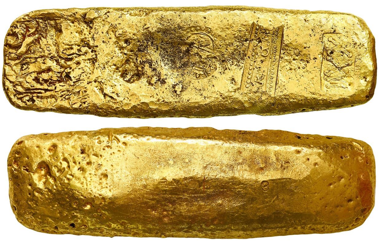 Gold bar ingot from the 1715 Fleet, 915 grams, marked with fineness XXII (22K), tax stamp
