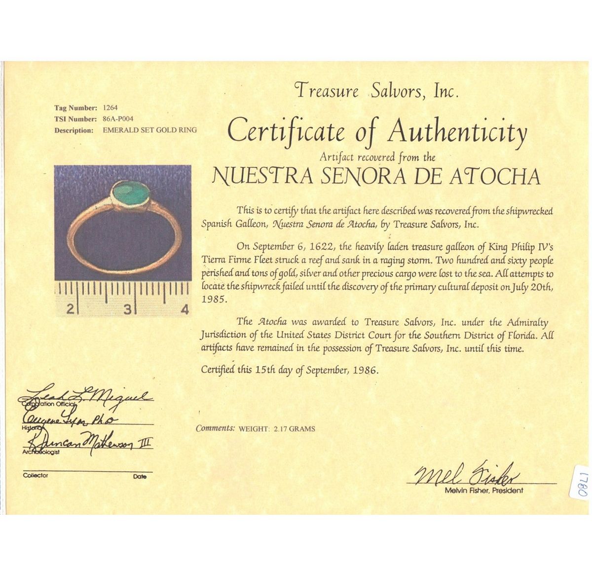 Gold/emerald ladies' ring, approx. 1 carat, size 4. 2.1 grams. A somewhat plain, gold-wire ring (slightly misshapen but wearable) but with nice, round emerald of attractive milky-green color, good clarity, with asymmetric facets on top (almost cabochon). With Fisher photo-certificate #86A-P004. Recovered from: Atocha, sunk in 1622 west of Key West, Florida