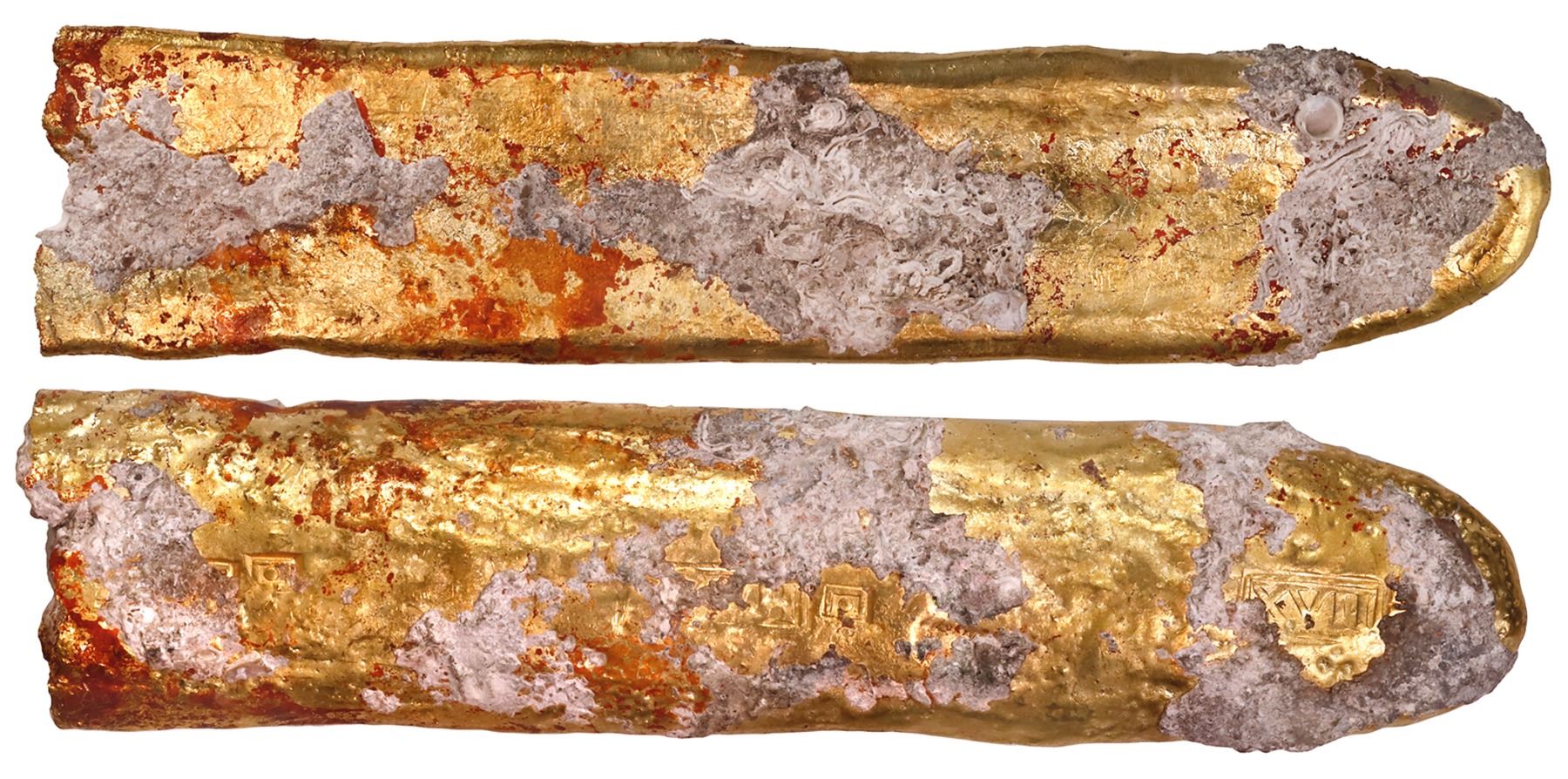 Gold "finger" bar, 668 grams, marked with fineness XVII• (17¼K), ex-"Golden Fleece wreck" (