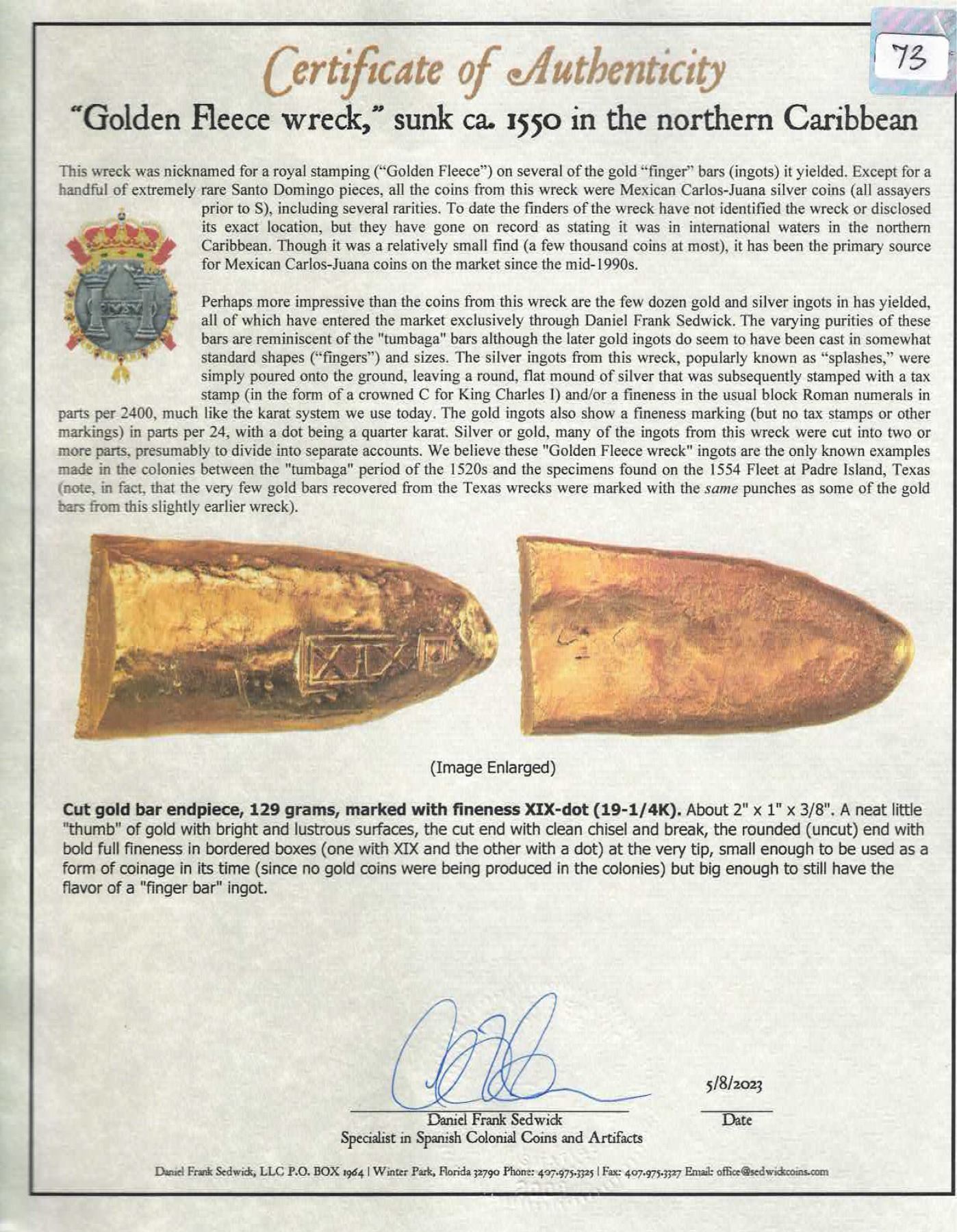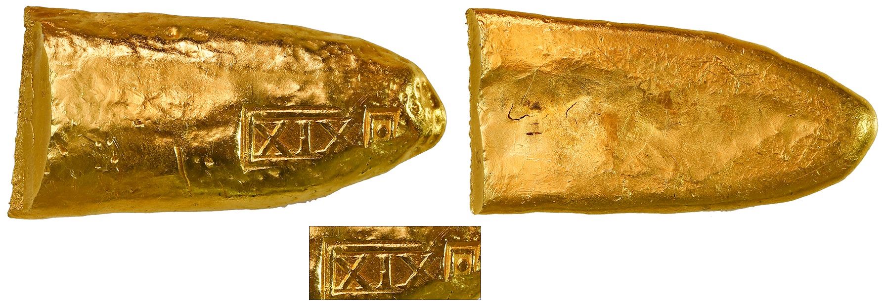 Gold "finger bar" end-cut, 129 grams, marked with fineness XIX• (19¼K), ex-"Golden Fleece Wreck" (ca. 1550). About 2" x 1" x 3/8". A neat little "thumb" of gold with bright and lustrous surfaces, the cut end with clean chisel and break, the rounded (uncut) end with bold full fineness in bordered boxes (one with XIX and the other with a dot) at the very tip, small enough to be used as a form of coinage in its time (since no gold coins were being produced in the colonies) but big enough to still have the flavor of a "finger bar" ingot. With photo-certificate.