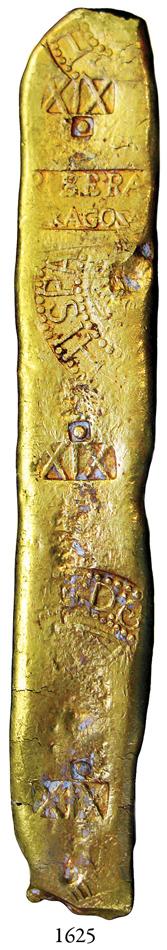 Gold "finger" bar from the Maravillas (1656), 336.3 grams, 19-1/4K. About 7" x 1" x 1/4". A very wide and flat ingot with one end chisel-cut twice (a bit crudely) and the other end rounded but with two small, cylindrical assayer's bites, the marked surface with 3 fineness markings of XIX in a box with single dot outside, 3 clear tax seals (plus part of another) with dotted borders and letters HISPA and DG visible, but best of all is the bold and nearly full foundry mark RIBERA / ZARAGOZA, which clearly refers to the Zaragoza mine and city in Colombia but also possibly to an assayer named Ribera (unless the RIBERA simply refers to the fact that the Zaragoza in Colombia, as opposed to the Zaragoza in Spain, is situated on the banks of a river), a significant artifact from a wreck that is not necessarily known for yielding many gold bars. From the Maravillas (1656), with color photo-certificate.
