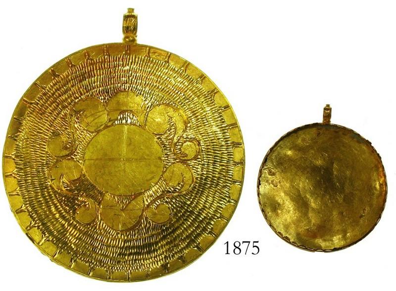 Gold locket pendant case. 10.1 grams, 1-7/8" in diameter. Bright and lustrous, high-grade gold, thin and round, believed to be the back of a locket (probably a reliquary), with loop at top for suspension, with floral design in center and scalloped edge, very impressive. Recovered from: 1681 Fleet off Panama (Boticaria site).