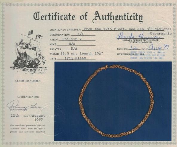 Gold "olive blossom" chain, 19.5 grams, 10-1/4" long, ex-1715 Fleet, with 18K clasp and connector attached to make into a wearable double-strand bracelet. Intriguing combination of an "olive blossom" chain (this one a four-petaled flower with no dot in center), modern rope chain and "lobster" clasp to create a double-stranded bracelet for a small wrist. A longer strand of modern chain could easily be used to expand the bracelet for larger wrists. From the 1715 Fleet, with photo-certificate.