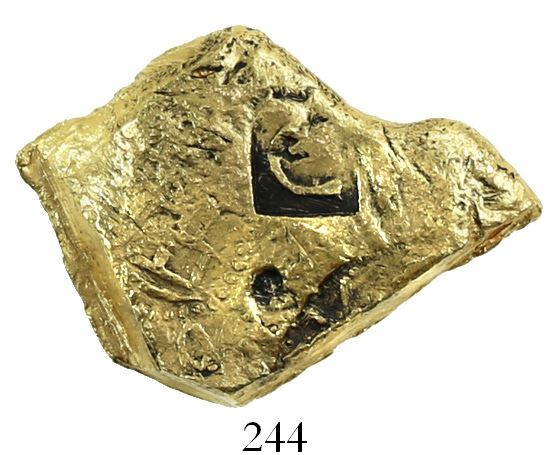 Gold  oro corriente  cut piece with stamp  C  (Charles I of Spain), 42.68 grams, from an unidentifie