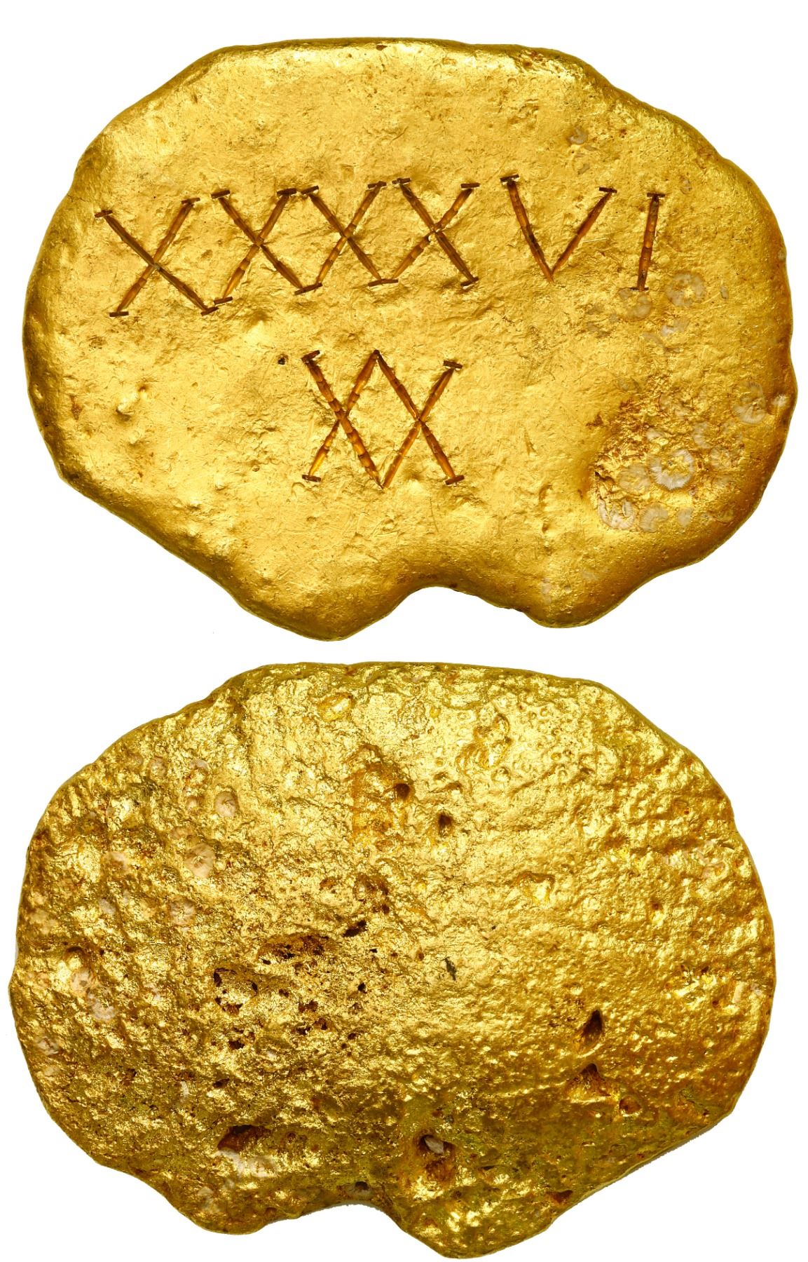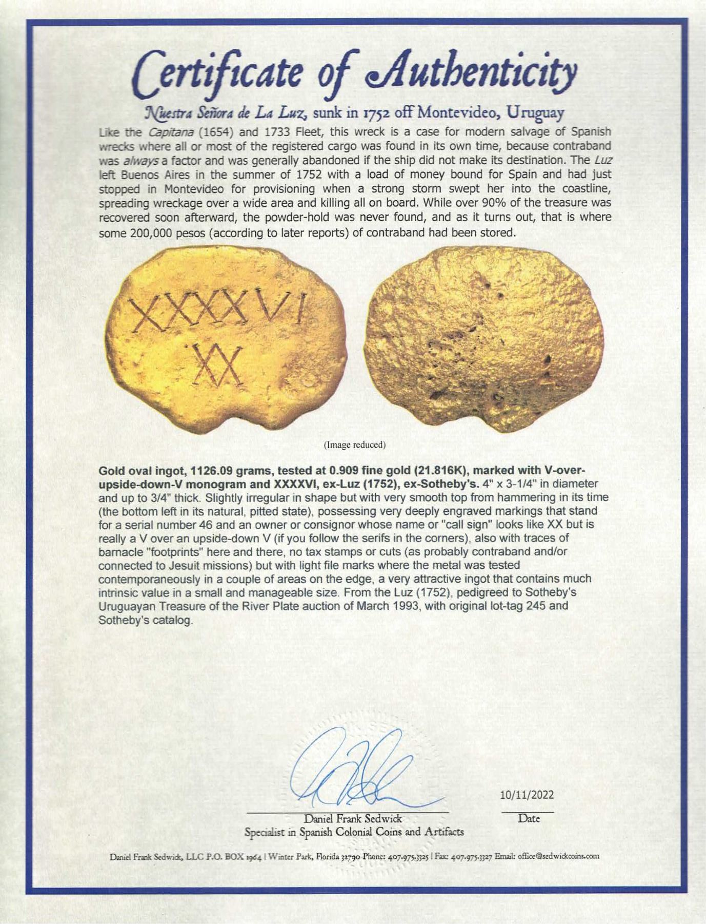 Gold oval ingot, 1126.09 grams, tested at 0.909 fine gold (21.816K), marked with V-over-upside-down-V monogram and XXXXVI, ex-Luz (1752), ex-Sotheby's. 4" x 3-1/4" in diameter and up to 3/4" thick. Slightly irregular in shape but with very smooth top from hammering in its time (the bottom left in its natural, pitted state), possessing very deeply engraved markings that stand for a serial number 46 and an owner or consignor whose name or "call sign" looks like XX but is really a V over an upside-down V (if you follow the serifs in the corners), also with traces of barnacle "footprints" here and there, no tax stamps or cuts (as probably contraband and/or connected to Jesuit missions) but with light file marks where the metal was tested contemporaneously in a couple of areas on the edge, a very attractive ingot that contains much intrinsic value in a small and manageable size. From the Luz (1752), pedigreed to Sotheby's Uruguayan Treasure of the River Plate auction of March 1993, with original lot-tag 245 and Sotheby's catalog.