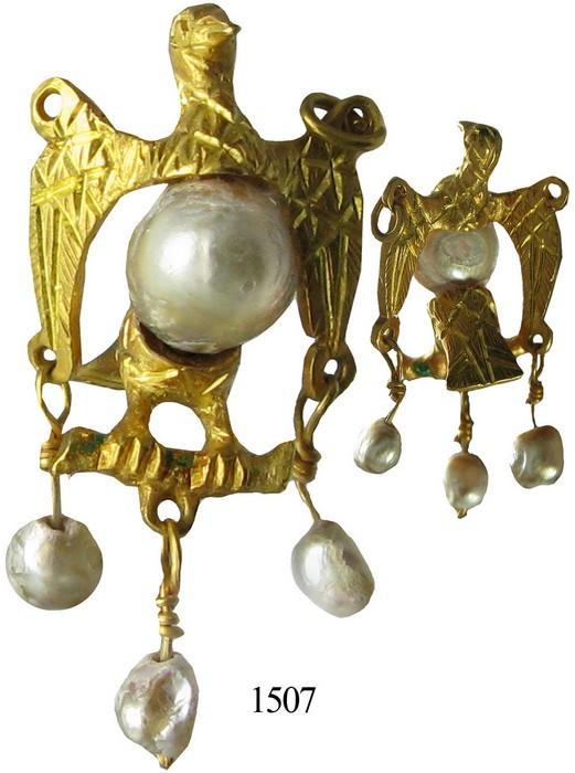Gold/pearl/emerald eagle pendant, rare. 4.3 grams, 1¼" x ½". This small but gorgeous jewel features an eagle with outspread wings and free-moving tail, studded with natural pearls and an emerald, in superb condition and still wearable, the gold bright and high grade, the pearls (one large and acting as the eagle's torso and the other two smaller and dangling from the tips of the wings) crudely shaped but very lustrous (good nacre), and the emeralds no more than brilliant-green chips on the eagle's perch. Though few pieces like this survive today, period paintings of wealthy Spaniards show avian pendants like this one (also a parrot with closed wings), which were popular gifts from the New World for royalty and nobility to wear (a similar eagle piece was found on the Atocha shipwreck of 1622). The designs of these elegant bird jewels was a challenge for goldsmiths, as most included moving parts and different materials like gemstones and pearls, as the intact piece on offer here demonstrates so well. Among the most significant Spanish colonial artifacts we have ever handled. Found in a Spanish colonial area in the southern Caribbean, ca. 1590.