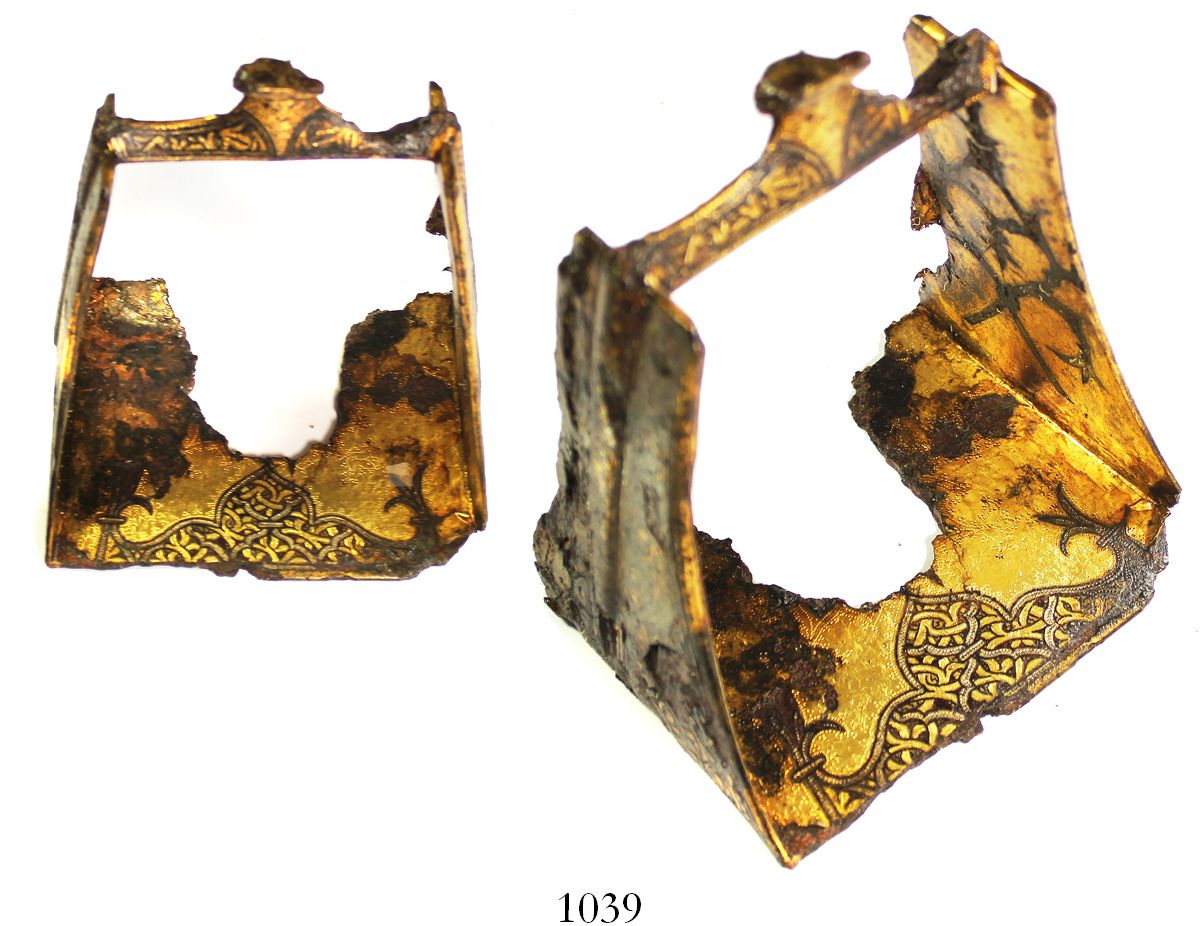 Gold-plated iron stirrup, Arabian design. 451 grams, about 5" x 4" x 5". A simple stirrup with two open ends but with curving Arabic design all over the surfaces, most of which have some gold leaf adhering to the otherwise rusty remains, intact except for a portion of the base, undoubtedly the property of a wealthy horseman on board the ship. From the mid-1500s "Pewter Wreck," with Global Marine Exploration photo-certificate #PC02153. Recovered from: "Pewter Wreck," sunk in the mid-1500s off Santo Domingo
