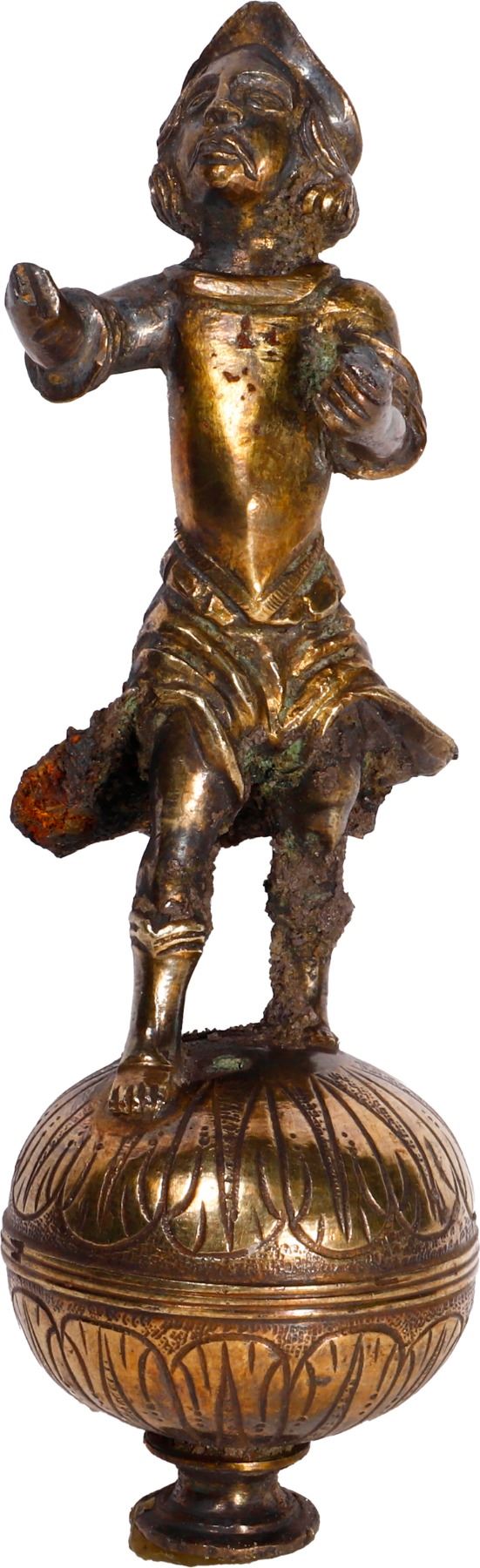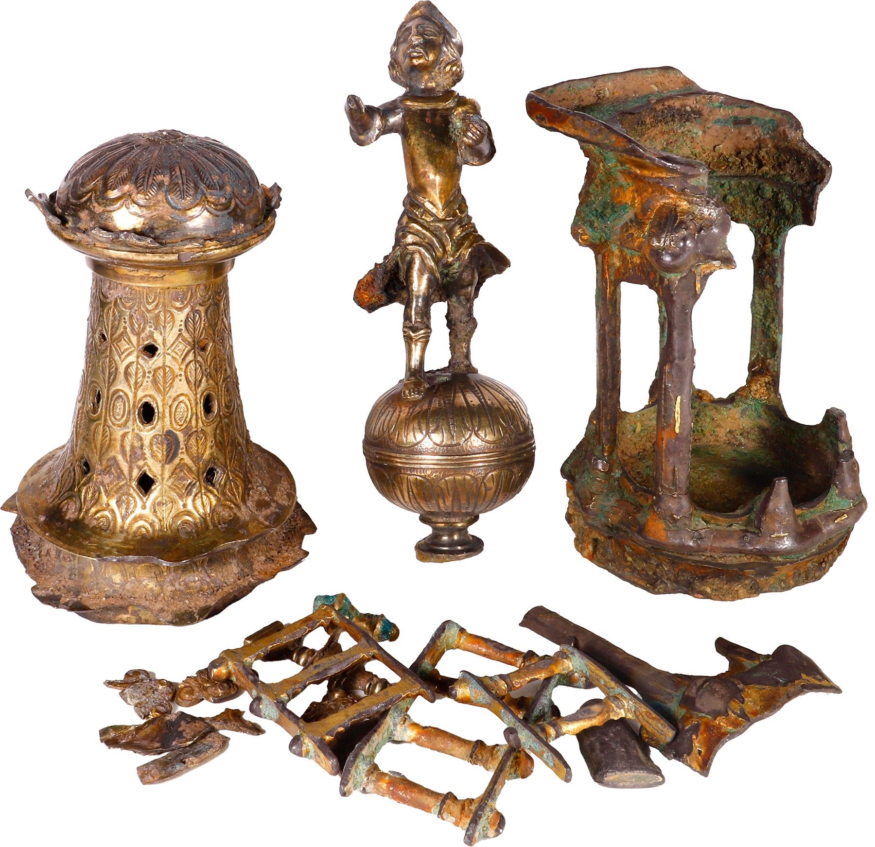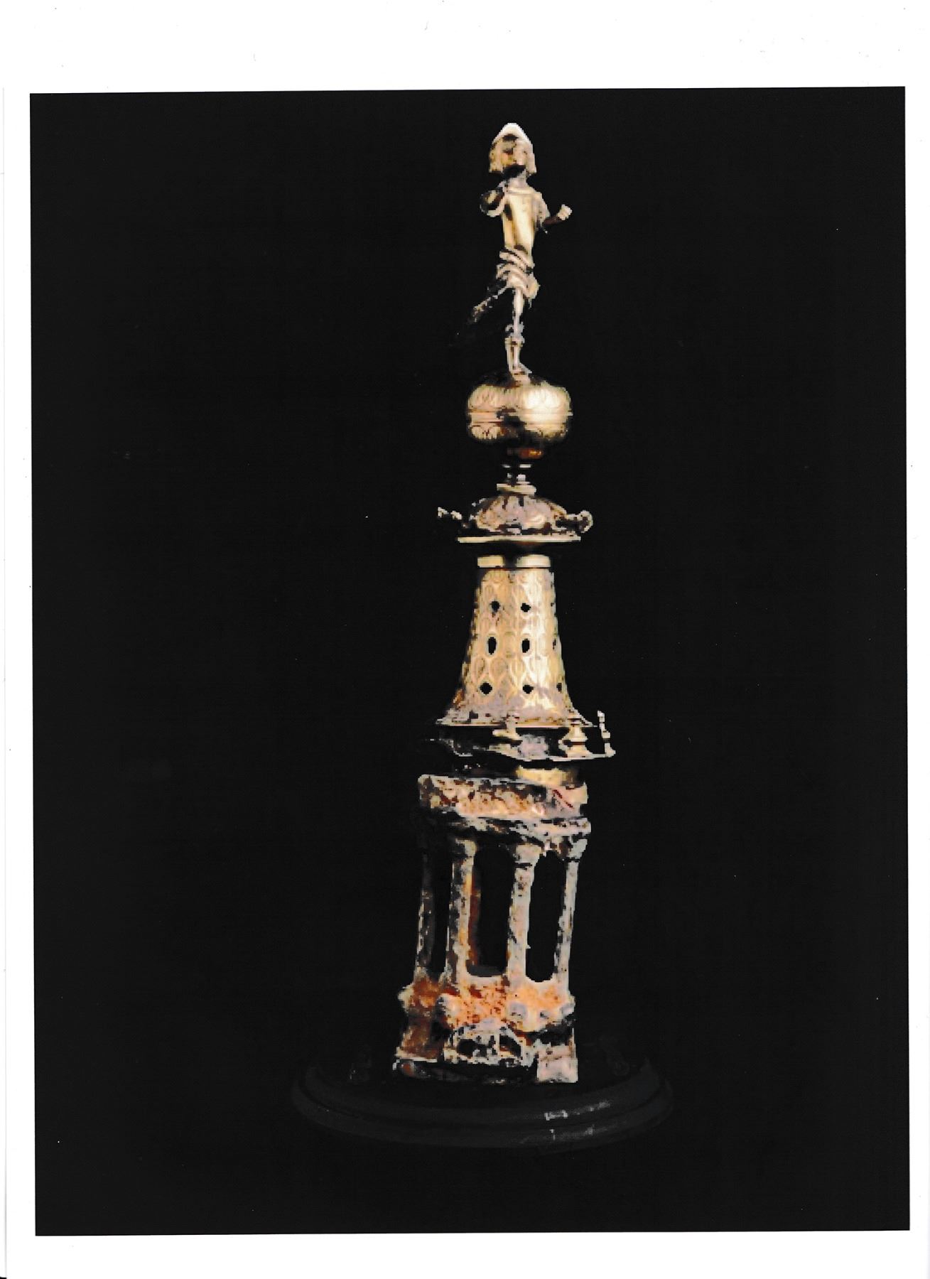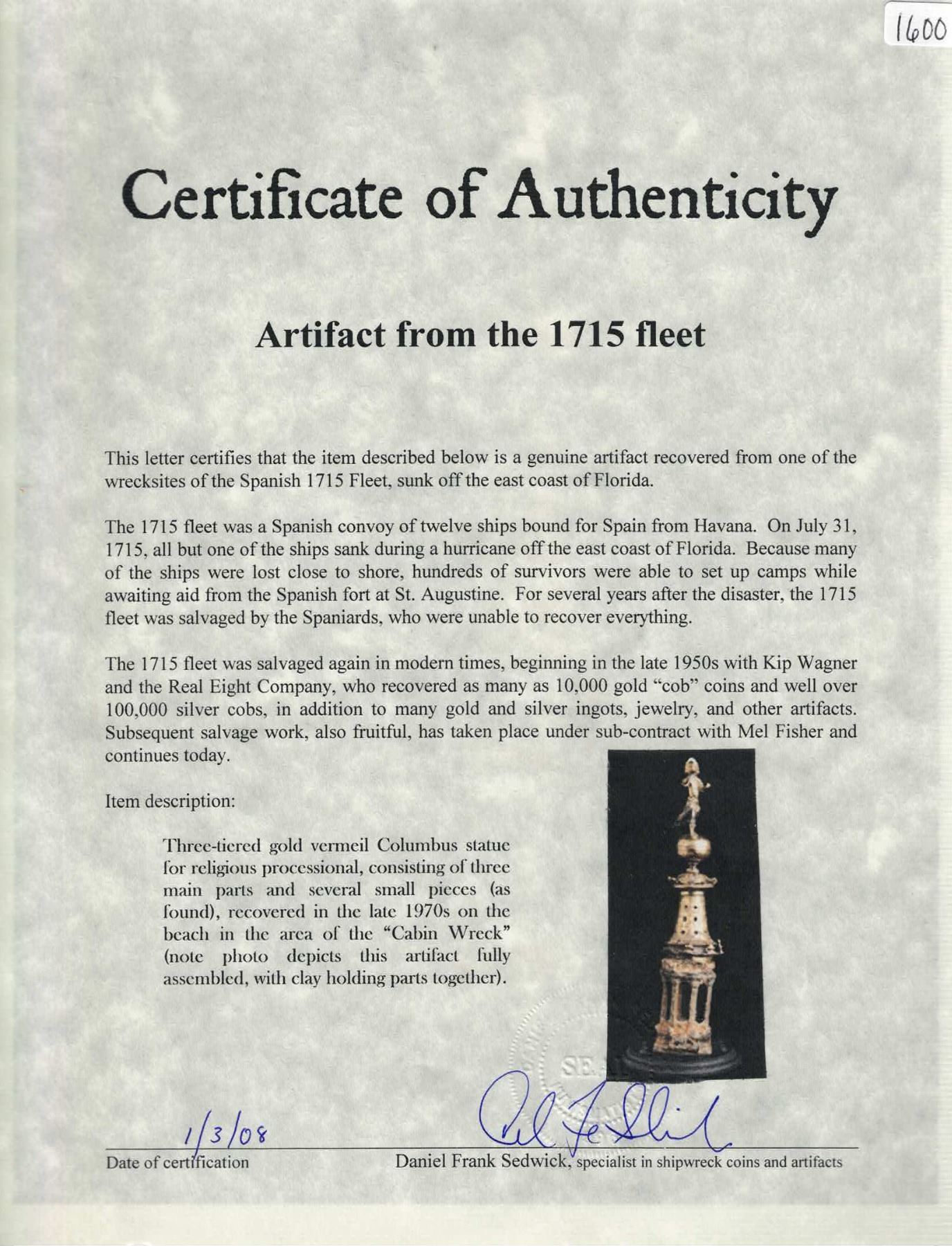 Gold-plated silver Columbus statue for religious processionals, ex-1715 Fleet. approx. 17 inches tall and 2.8 lbs (total) Research and careful reassembly (per the accompanying photo) revealed that this fascinating artifact, consisting of three main parts and several small pieces (as found), the main part filled with encrustation, is a three-tiered gold vermeil sacramental with Columbus statue at top of a type used in religious processions in the streets of Spanish colonial cities in the Americas. The use of Columbus on a New World church relic is not unusual, as the Spanish culture revered him as the original vehicle for spreading Christianity in the Americas. The accompanying certificate states it was found in the "Cabin Wreck" area in 1978-80 along with a six-foot gold rosary and three rings, which were all shown to and reviewed by Mel and Deo Fisher in 1990. XRF results: 67.50% gold, 30.88% silver. From the 1715 Fleet, with Sedwick photo-certificate from 2008 and Karen McKee certificate from 2007.