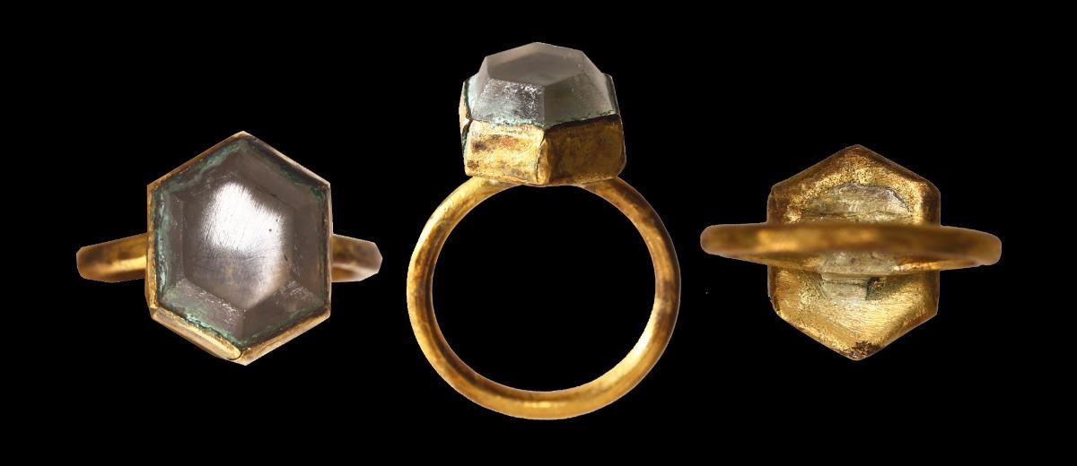 Gold ring with bluish quartz stone (hexagonal cut). 8.67 grams, size 7. Very thick and translucent stone (lacking brilliance due to the way it is mounted) with six flat gold sides simply pushed up against the stone and soldered to a simple, thick-wire ring, rather large for Spanish colonial-era fingers so probably meant to be worn over a glove. The stone itself is clear but appears slightly blue due to oxidation of copper impurities in the gold. Found on the beach at the Corrigans site. Recovered from: Spanish 1715 Fleet, east coast of Florida