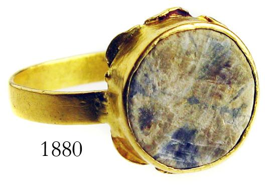 Gold ring with gray stone. 2.7 grams, size 5-1/4. Flat, ribbon-like band of high-grade gold with flower-like bezel at top containing a flat, round grayish stone or porcelain with faint blue cross-like design. Recovered from: 1681 Fleet off Panama (Boticaria site).