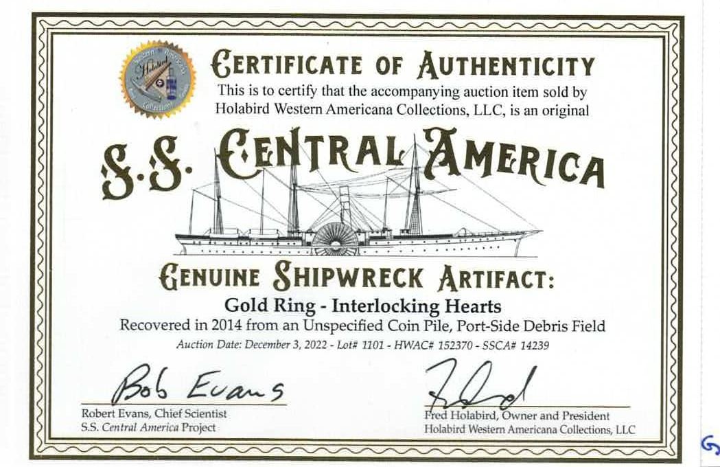 Gold ring with interlocking hearts, 3.36 grams total, size 7, ex-S.S. Central America (1857). 3.36 grams. This cute ring consists of two vertically interlocking hearts, possibly part of the Shreve shipment. It is certified as being recovered in 2014 from an "Unspecified Coin Pile, Port-Side Debris Field." From the S.S. Central America (1857), pedigreed to the Holabird auction of December 2022, with original lot-tag 1101 and certificate signed by Holabird and Bob Evans.