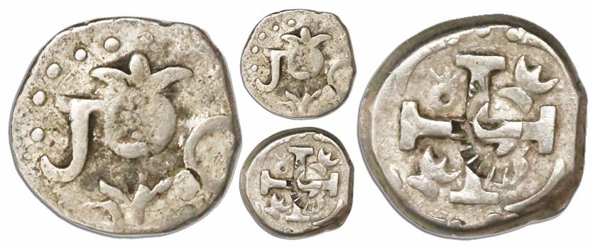 Granada, Nicaragua, provisional "imitation cob" 1/2 real, 1824, with radiant Liberty Cap countermark (1824) of Leon, Nicaragua, on cross, very rare, ex-Richard Stuart. KM-5. 1.69 grams Very nice VF with full cross (with pomegranates instead of lions in quadrants) and full but weak countermark, full J-pomegranate-G (for Junta de Granada, pomegranate = granada in Spanish) above weak date on obverse (the date typically off the flan), no hole or damage. As Jara explains in his 2007 work Central American Provisional and Provincial Mints, the application of the Leon countermark on the Granada cobs "is hardly surprising: although these cities were bitter political rivals, the practical goal of allowing a coinage of acceptable quality to circulate always prevailed over purely political matters and one could expect the Granada coins to circulate in Leon and vice-versa." Pedigreed to the Richard Stuart collection.