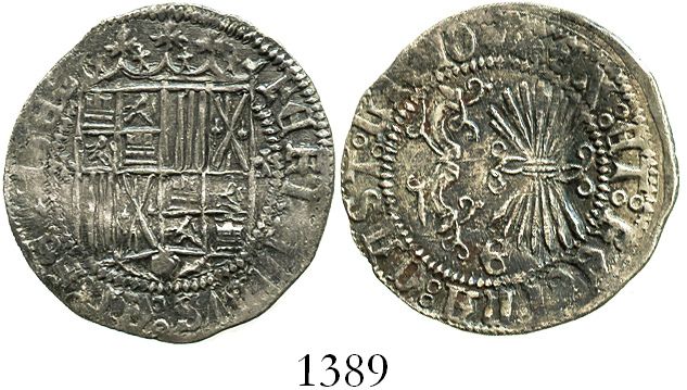 Granada, Spain, 1 real, Ferdinand-Isabel, assayer ermines flanking shield, mintmark Gothic G on reverse. CT-Type 216. 3.2 grams. Toned UNC with slight wrinkle in flan, perfect inner details and nearly full legends (Gothic letters).