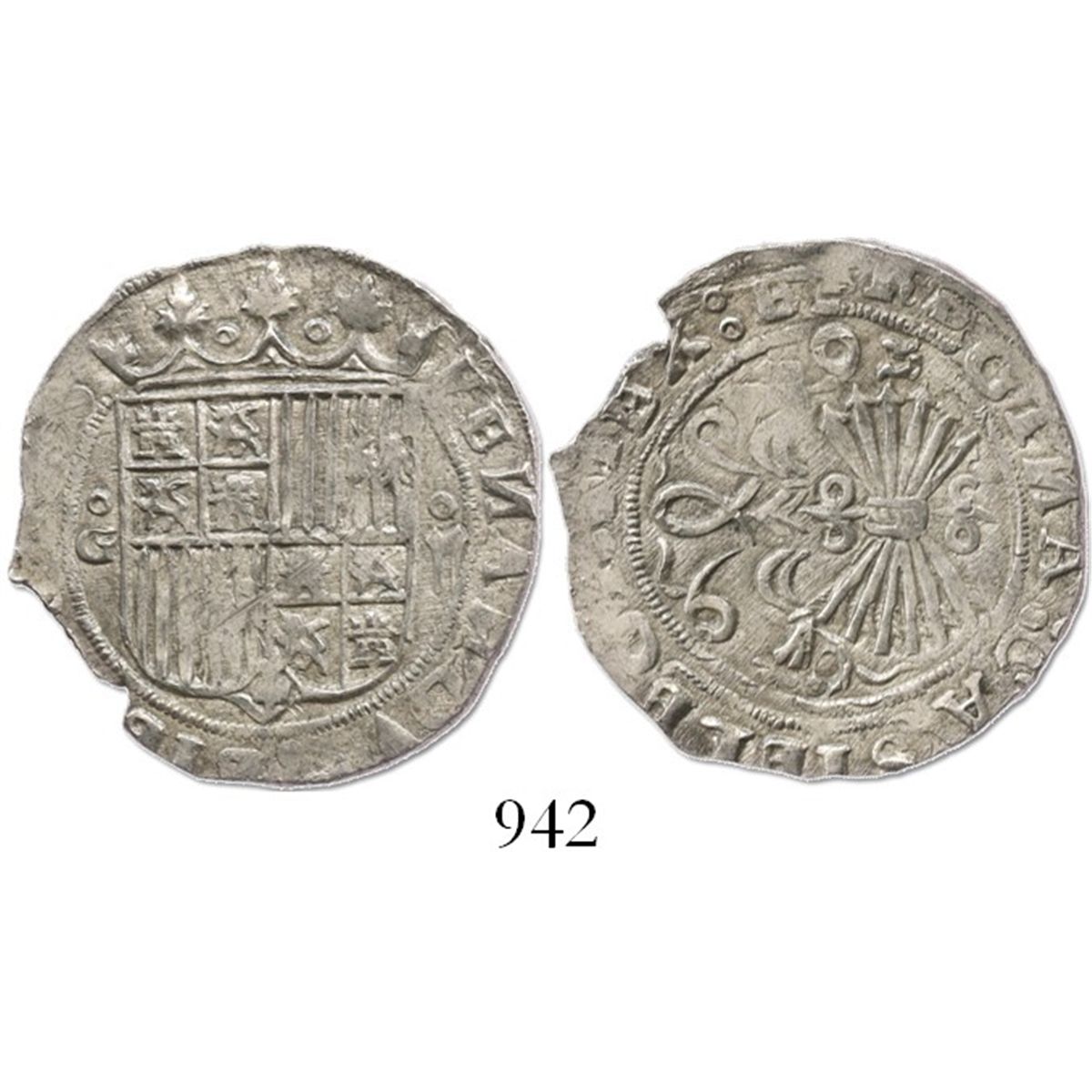 Granada, Spain, 2 reales, Ferdinand-Isabel, assayer R (Gothic) to left of arrows.