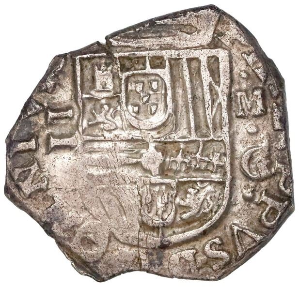 Granada, Spain, cob 2 reales, 160?M, OMNIVM type. Cal-Type 117; KM-17.3. 6.78 grams. Choice full cross-lions-castles (bold and well centered), also bold full shield (left side weak) with equally bold M-G to right and denomination II to left, king's name in legend followed by OMNIVM, AU with mostly deep toning and traces of luster.