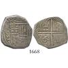 Granada, Spain, cob 2 reales, Philip II, 1597 date to left, assayer C to right of shield. CT-304. 6.9 grams. Bold full date, nearly full and well-detailed shield and crown and cross, AVF with attractive toning.