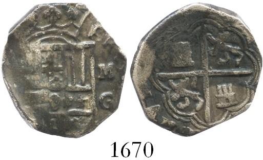 Granada, Spain, cob 2 reales, Philip II or III, assayer M above mintmark G to right.