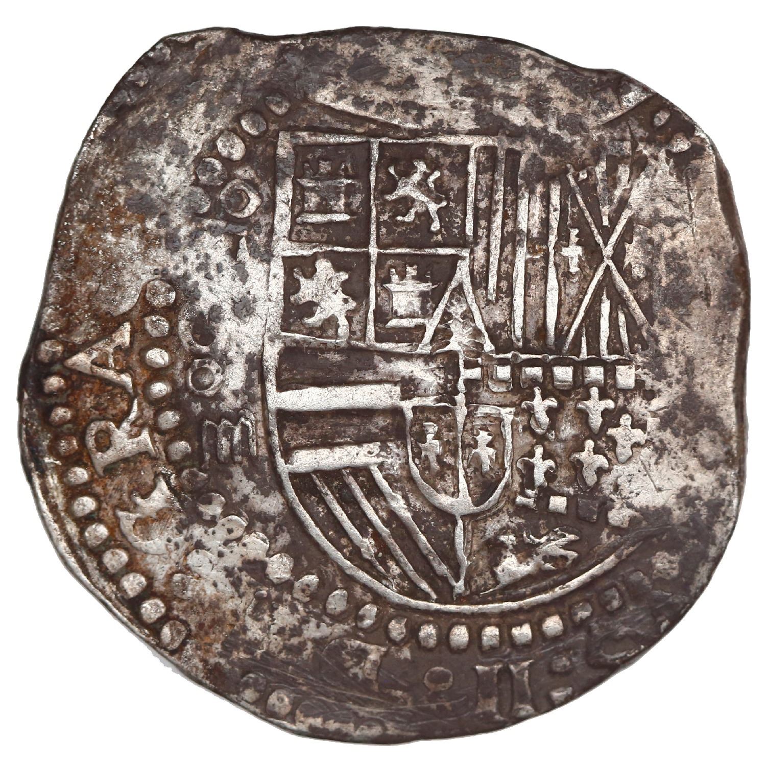 Granada, Spain, cob 4 reales, Philip II, assayer oF above mintmark G above denomination o-iiii to left (unlisted variety). Cal-Type 153. 13.50 grams. Rare variety unrecorded in Calico with assayer, mintmark, and denomination all to the left of the shield. AU with surface stains and tooling along the edge, bold full shield a little off-center plus king's ordinal II visible in legend, nicely centered cross.