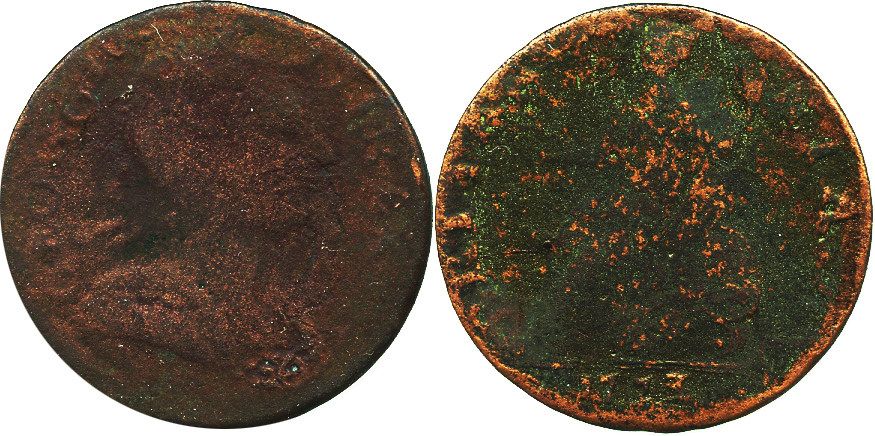 Great Britain, 1/2 penny, George III, 1773. KM-601. 6.9 grams. Heavily worn and corroded but with clear date below Britannia, dark all over and greenish on the reverse. With Sedwick certificate from 2006. Recovered from: Faithful Steward, sunk in 1785 off Delaware