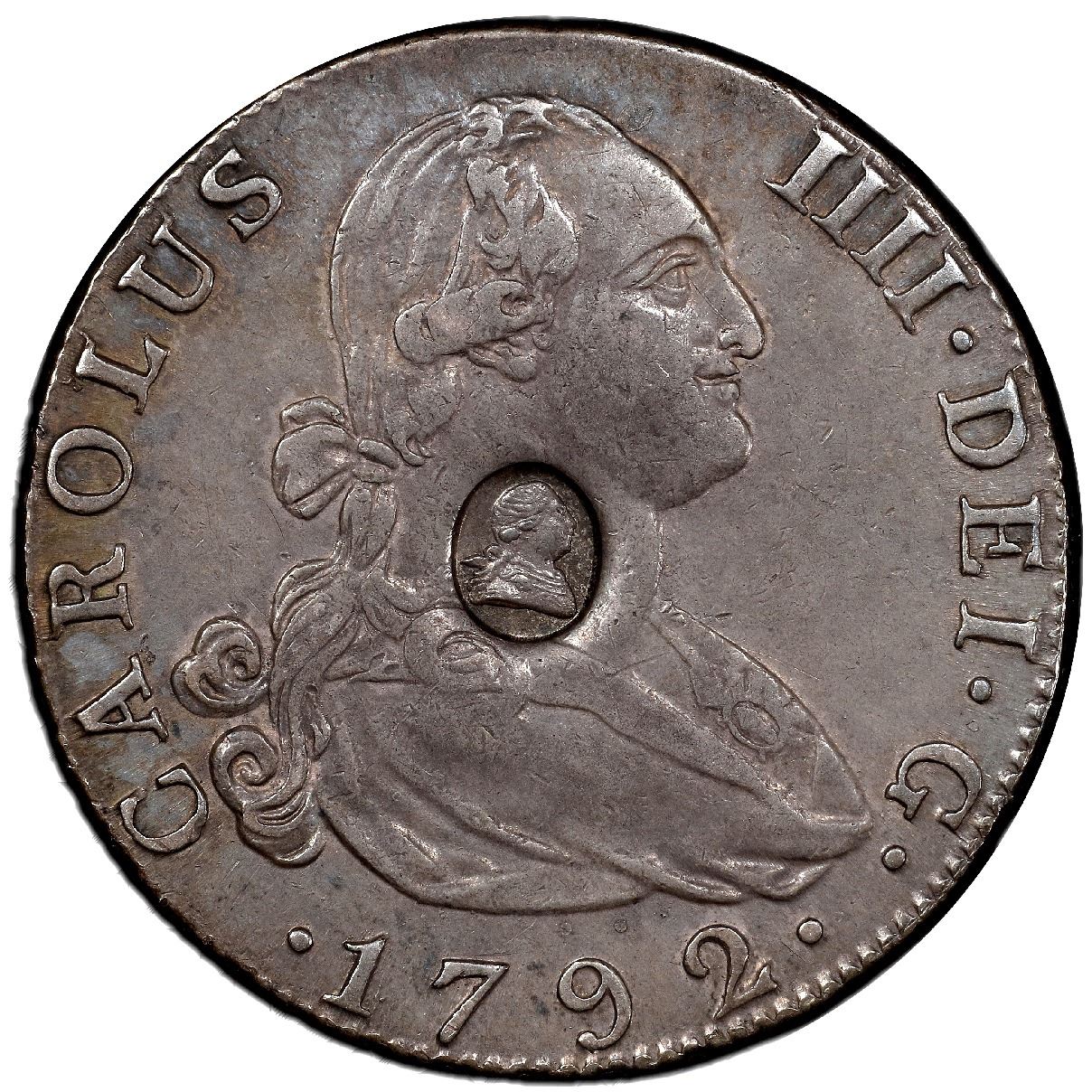 Great Britain, Bank of England, half dollar, oval George III countermark (1797-99) on obverse of a Madrid, Spain, bust 4 reales, Charles IV, 1792 MF, PCGS AU53, c/m AU detail. Sp-3767; KM-unl (cf 622.1). Very deep countermark with 100% full details, richly toned all over, with satin surfaces and only lightly worn high points on the host, popular type.