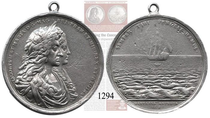 Great Britain, James II, silver medal commemorating the salvage of the Concepción by William Phips in 1687. 63.8 grams. A rare and highly sought original medal struck from silver recovered in 1687 by New Englander Phips, who was knighted for his deed, with portraits of James II and Mary on the obverse and a salvage scene on the reverse, a bit worn (AVF) and with old loop attached to top.