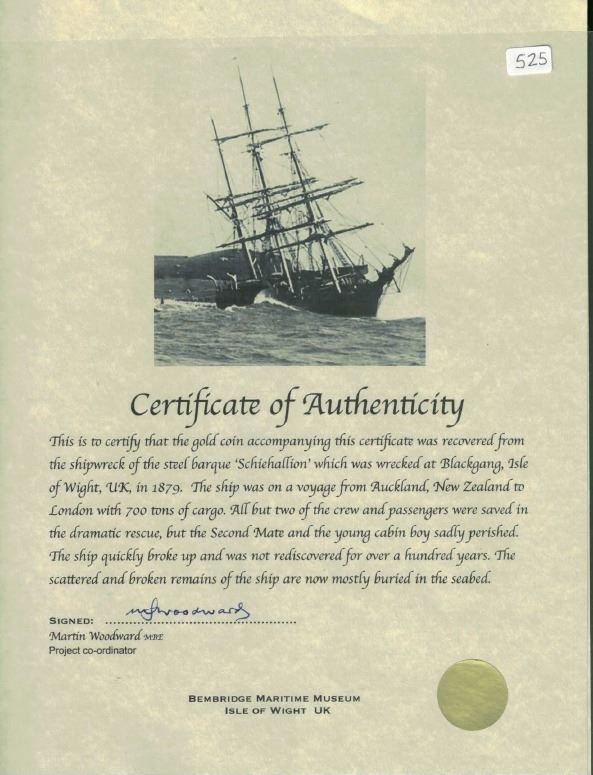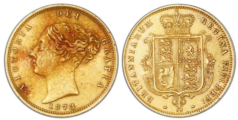 Great Britain (London, England), gold half sovereign, Victoria (young bust), 1873. Sp-3860D; KM-735.2. 3.99 grams. XF with patches of red toning on obverse. With certificate from the salvager. Recovered from: Schiehallion, sunk in 1879 off the Isle of Wight, south of England