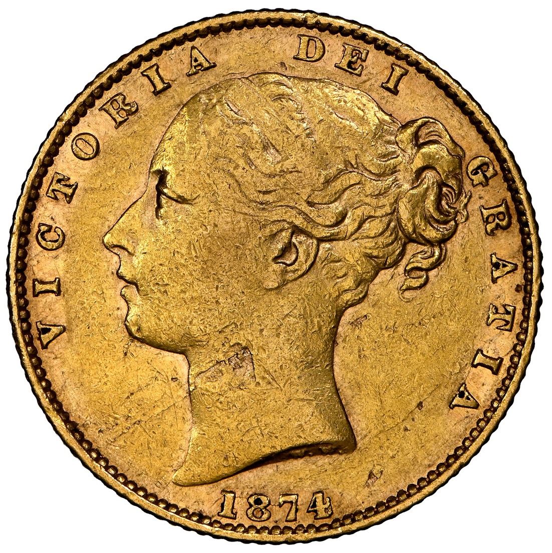 Great Britain (London, England), gold sovereign, Victoria, 1874, shield reverse with die 32 below wr