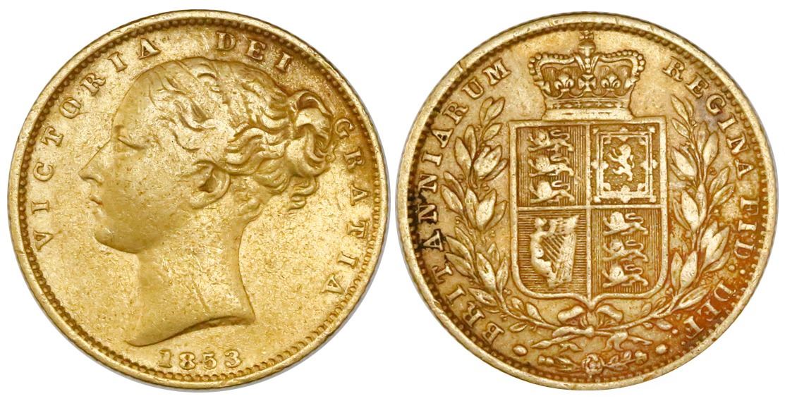 Great Britain (London, England), gold sovereign, Victoria (young bust), 1853, with WW in relief.
