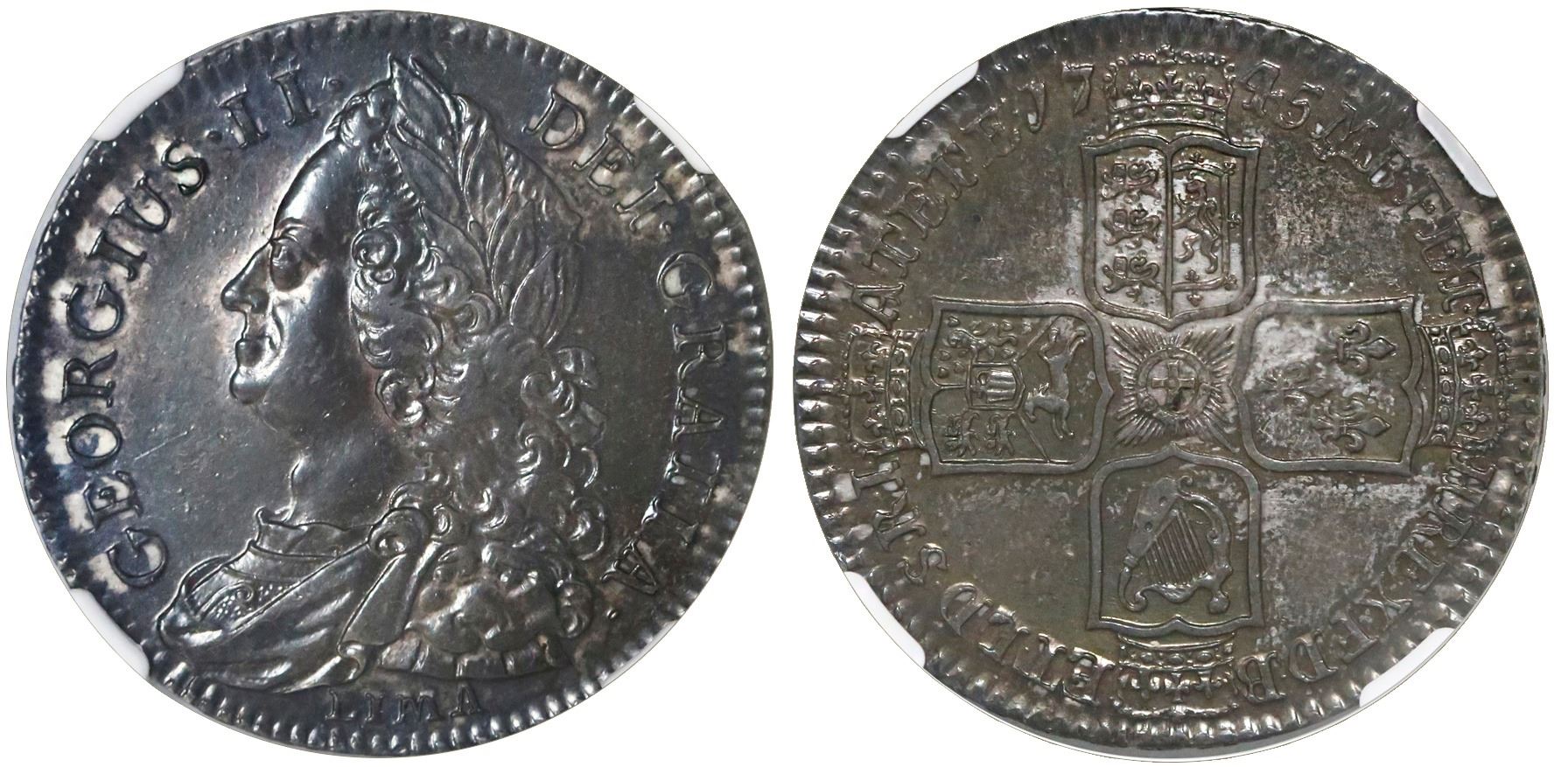 Great Britain (London, England), half crown, George II, 1745, with LIMA below bust, NGC AU 55. Sp-3695; KM-584.3. Deeply toned over "greasy" luster (stronger on reverse), minimal high-point wear, choice example of a popular type made from silver captured from the Spanish off Peru. NGC #4822203-005.