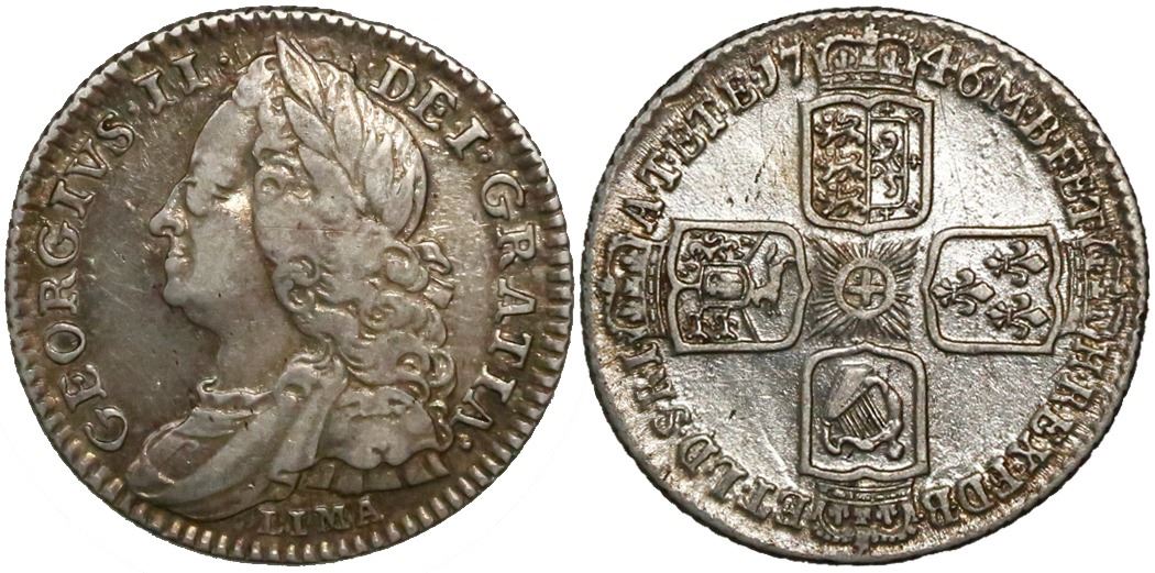 Great Britain (London, England), sixpence, George II, 1746, with LIMA below bust.