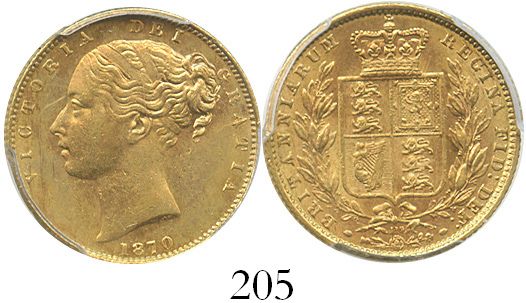 Great Britain (London, England), sovereign, Victoria (young head), 1870, die #119, WW in relief, from the Douro (1882), encapsulated PCGS AU58. Sp-3853B; KM-736.2. Good luster, no problems but bagmarks as usual, more like Mint State to our eyes but more valued for its provenance anyway. From the Douro (1882).