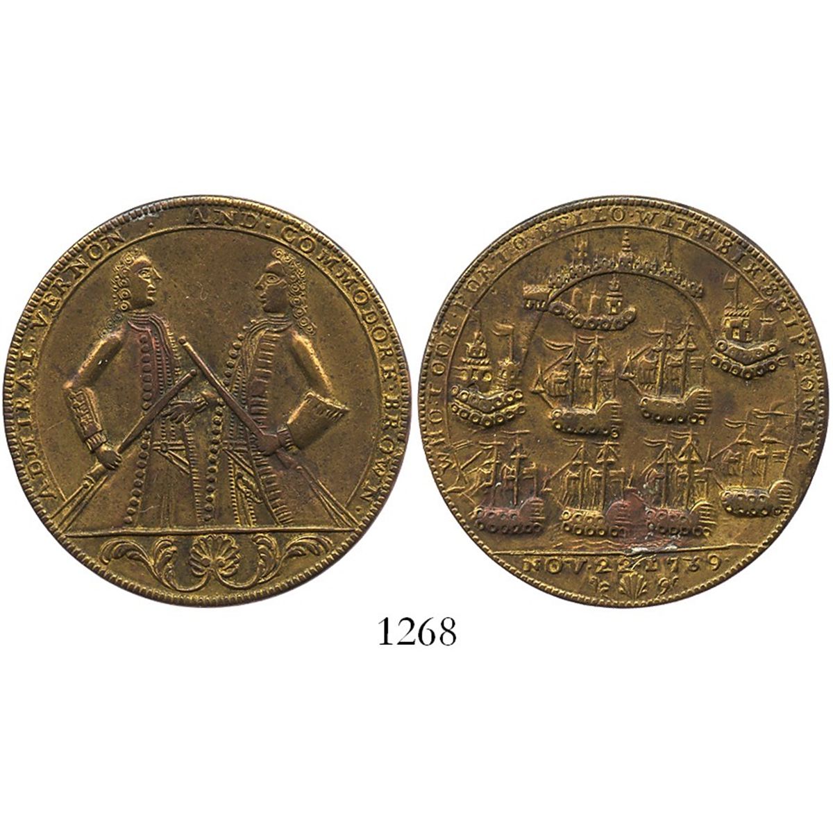 Great Britain, brass "Admiral Vernon" medal, Porto Bello, 1739, Vernon and Brown. Adams PBvb-12-T. 12.8 grams. Choice XF+ specimen with original, lustrous brass color all over, hint of rainbow-toning, no flaws.