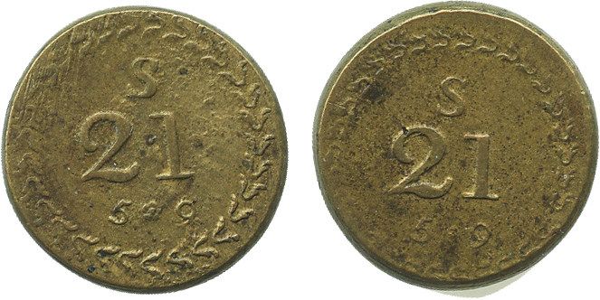 Great Britain, brass coin-weight for "21 schillings" (gold), probably late 1700s. 8.3 grams. Both sides of this 4mm-thick brass piece show a large 21 below S and above 5-flower-9 in a laurel border, presumably issued and used under George III (1760-1820), appears to be XF or AU for grade.