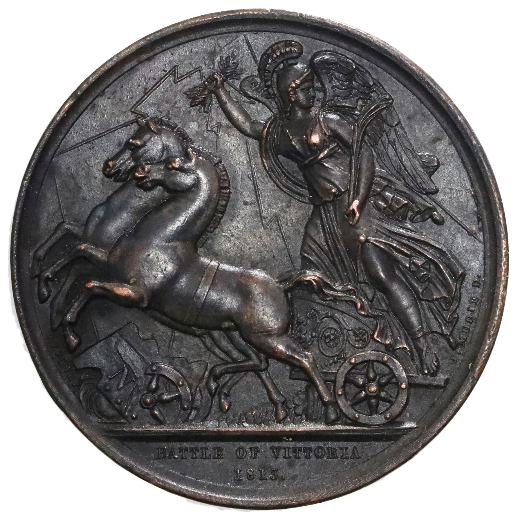 Great Britain, bronze commemorative medallion, Arthur Wellesley Duke of Wellington / Battle of Vittoria, 1813. Eimer-1033. 32 grams. Obverse: ultra-high-relief bust of Wellesley with legend reading ARTHUR DUKE OF WELLINGTON, MILLS F and MUDIE D below bust; reverse: high relief Bellona (Roman goddess of war) driving chariot past a wrecked chariot with the letter N on it (representing Napoleon's forces), BATTLE OF VITTORIA / 1813. below in exergue; smooth edge. AU with minor cabinet friction on the high points. With photo-certificate.