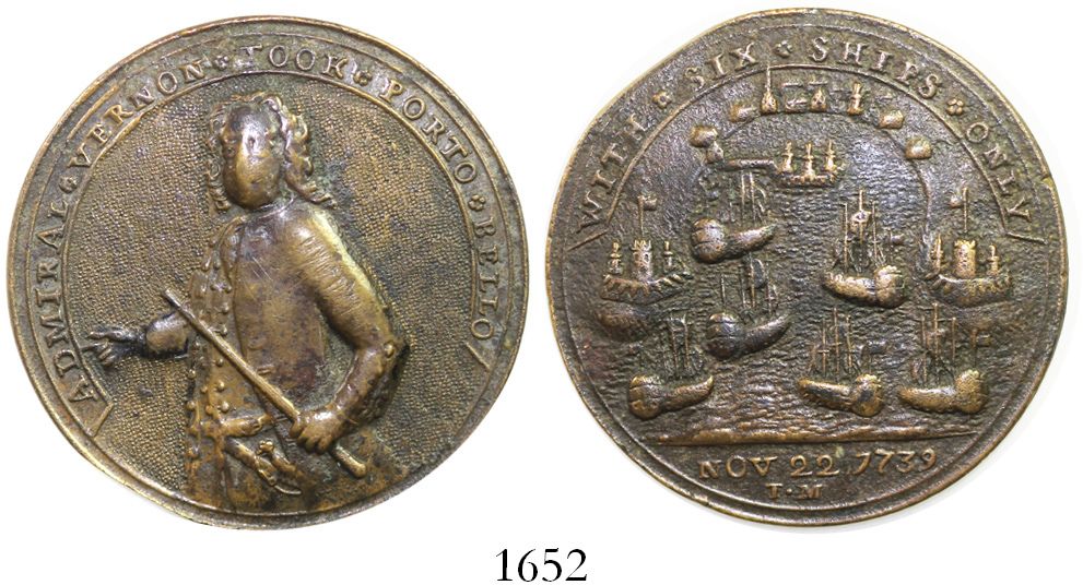 Great Britain, copper "Admiral Vernon" medal, Portobelo, 1739. Adams-PBv10H. 19.13 grams. Brassy VF in high relief, all intact (the high points worn), interesting stippled fields on obverse.