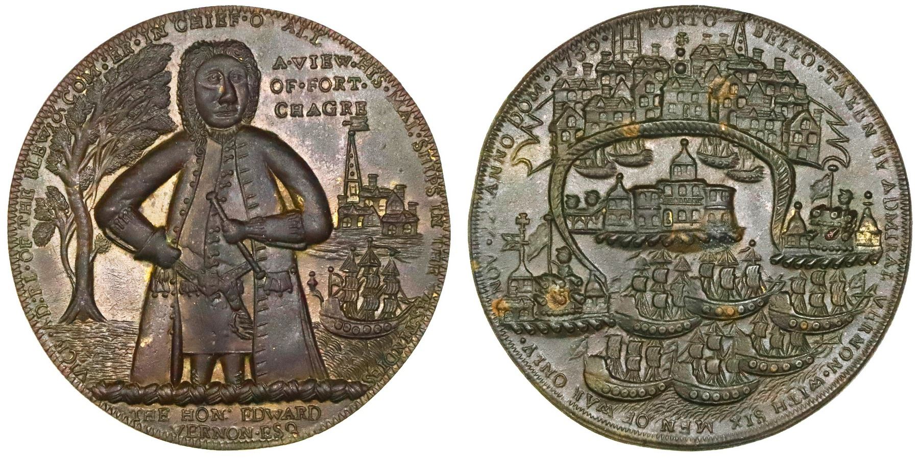 Great Britain, copper-alloy Admiral Vernon medal, 1739, Porto Bello / Fort Chagre, ex-Adams. AC-FCv1A. 40 mm; 13.78 grams. Choice, fully detailed AU+ with a crisp strike on a prime planchet, chocolate brown with spots of brass color, by far the best example we have offered of this type. Pedigreed to the John Adams collection.