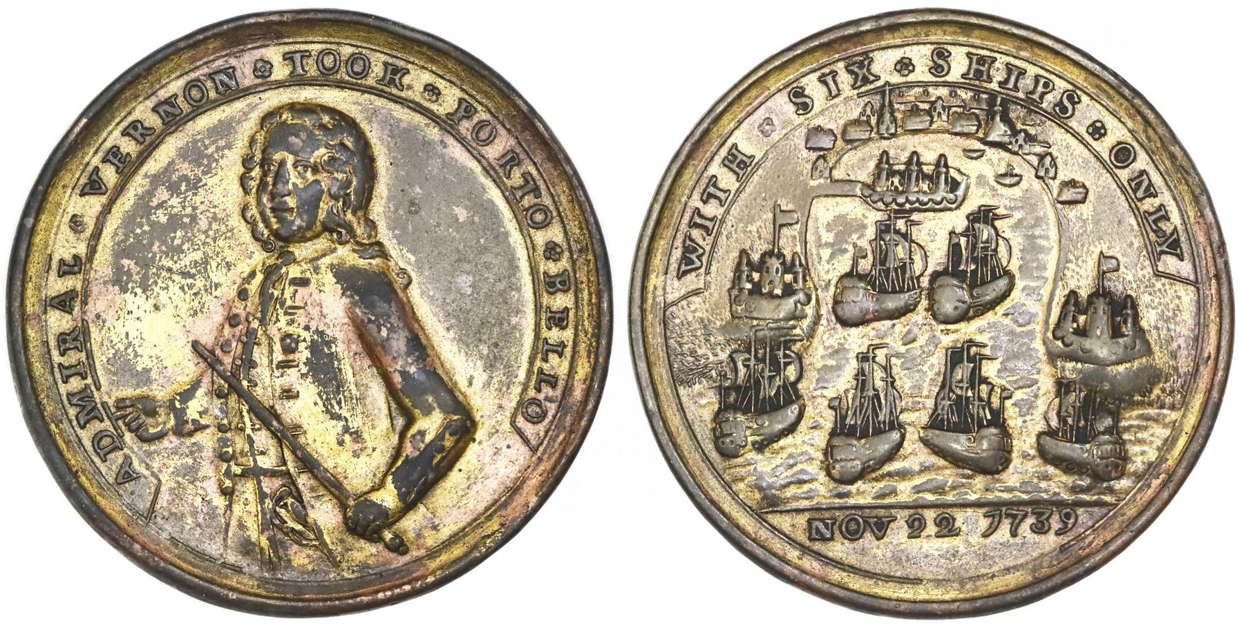 Great Britain, copper-alloy Admiral Vernon medal, 1739, Porto Bello, Vernon alone, ex-Adams. AC-PBv13K. 40 mm; 15.77 grams. VF example on an especially large planchet with thick, raised rims, patches of previous plating on surfaces (possibly gold), some scratches. Pedigreed to the John Adams collection.