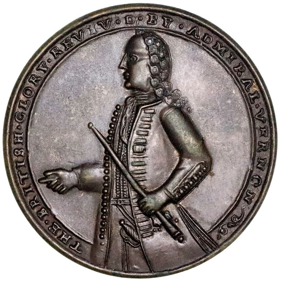 Great Britain, copper-alloy Admiral Vernon medal, 1739, Porto Bello, Vernon alone, ex-Adams. AC-PBv46RR. 14.77 grams; 37mm. Bold AU+, in fact no wear at all, even on the highest points, but also no luster and rather matte all over, dark brown in color. Pedigreed to the John Adams collection.