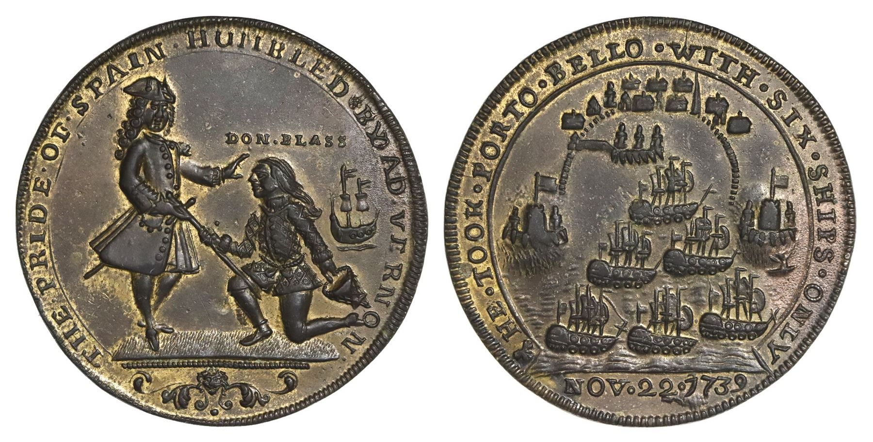 Great Britain, copper-alloy Admiral Vernon medal, 1739, Porto Bello, Vernon and Don Blass, ex-Adams. AC-PBvl2B. 37 mm; 14.11 grams. AU- with sharp design elements, some minor surface pitting at 3 o'clock, dark brown color with gold toning around details. Pedigreed to the John Adams collection.