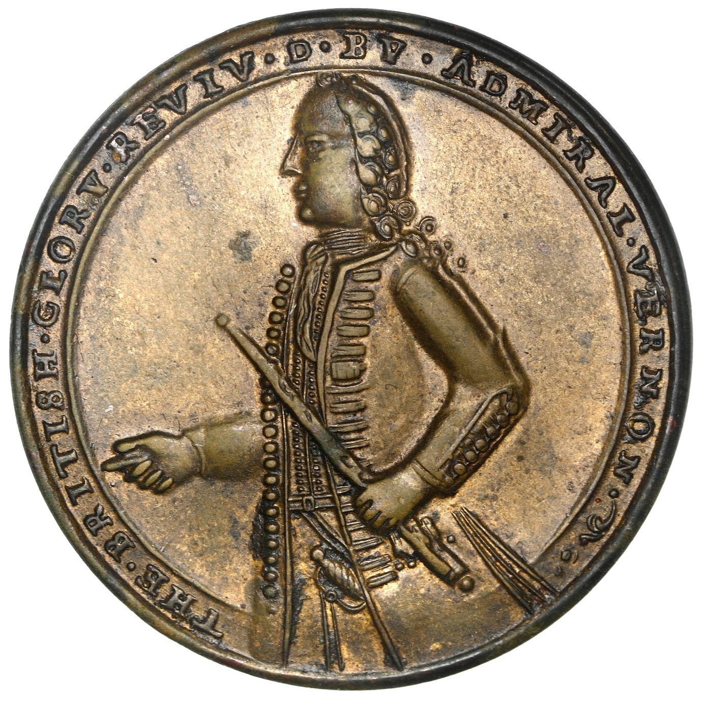 Great Britain, copper alloy Admiral Vernon medal, 1739, Vernon / Porto Bello, ex-Craige, ex-Adams (plate). AC-PBv46QQ; Betts-unl. 18.28 grams, 38 mm. Choice AU with muted luster, dark reverse, lighter original color on obverse. XRF: 39.69% copper, 52.94% zinc, 4.82% lead. Pedigreed to the John Adams Collection (with his handwritten tag) and the Ted Craige Collection, plated on page 82 of Medallic Portraits of Admiral Vernon (2010), by Adams and Chao.