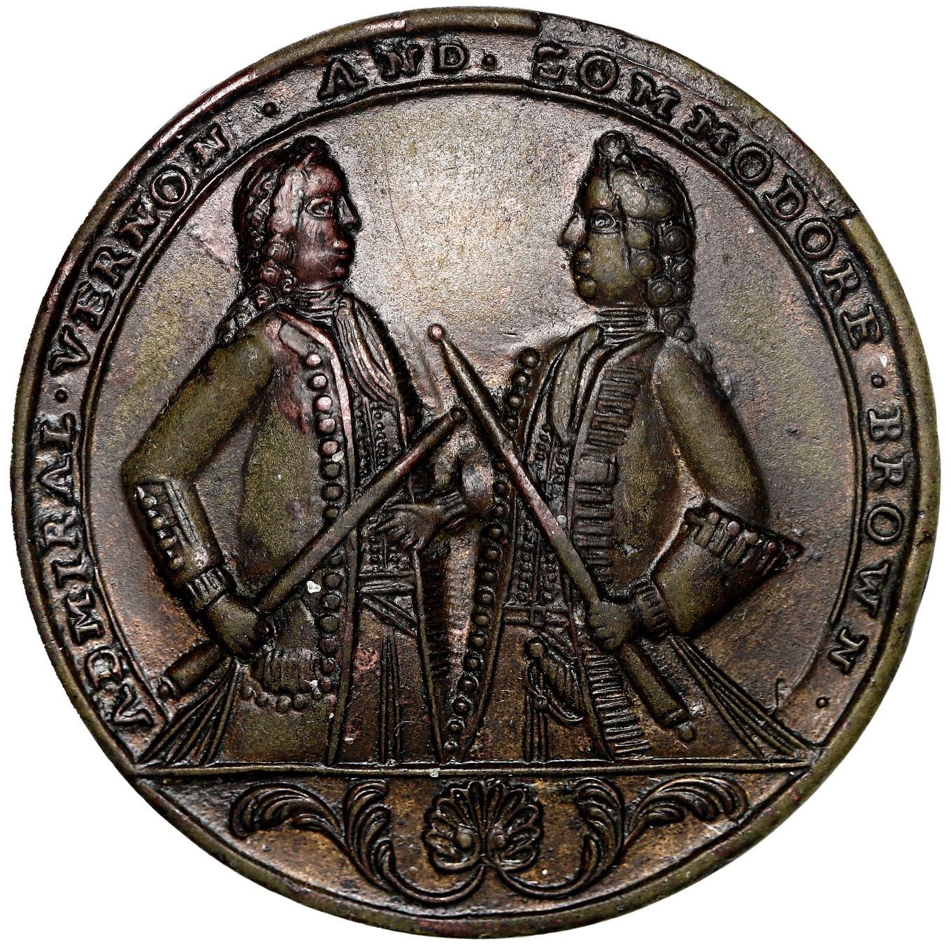 Great Britain, copper alloy Admiral Vernon medal, 1739, Vernon and Brown / Porto Bello, ex-Adams (plate), ex-Craige. AC-PBvb11S. 15.66 grams; 38 mm. Sharply detailed AU-, with nicely contrasting fields in olive green color, faint die-crack at top of obverse. XRF: 40.67% copper, 50.65% zinc, 4.93% lead. Pedigreed to the John Adams Collection (with his handwritten tag) and to the Ted Craige Collection, plated on page 124 of Medallic Portraits of Admiral Vernon (2010), by Adams and Chao.
