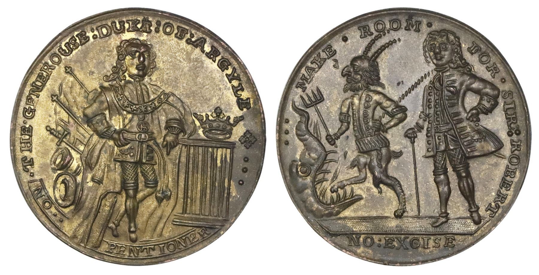 Great Britain, copper alloy Admiral Vernon medal, Duke of Argyle (ca. 1739), ex-Adams. AC-NLa1A. 37 mm; 12.13 grams. Mint State with well-struck details and smooth fields without any problems, mostly dark brown with patches of original brass color and luster, the best example we have offered of this popular type depicting Satan leading Walpole into Hell. Pedigreed to the John Adams collection.