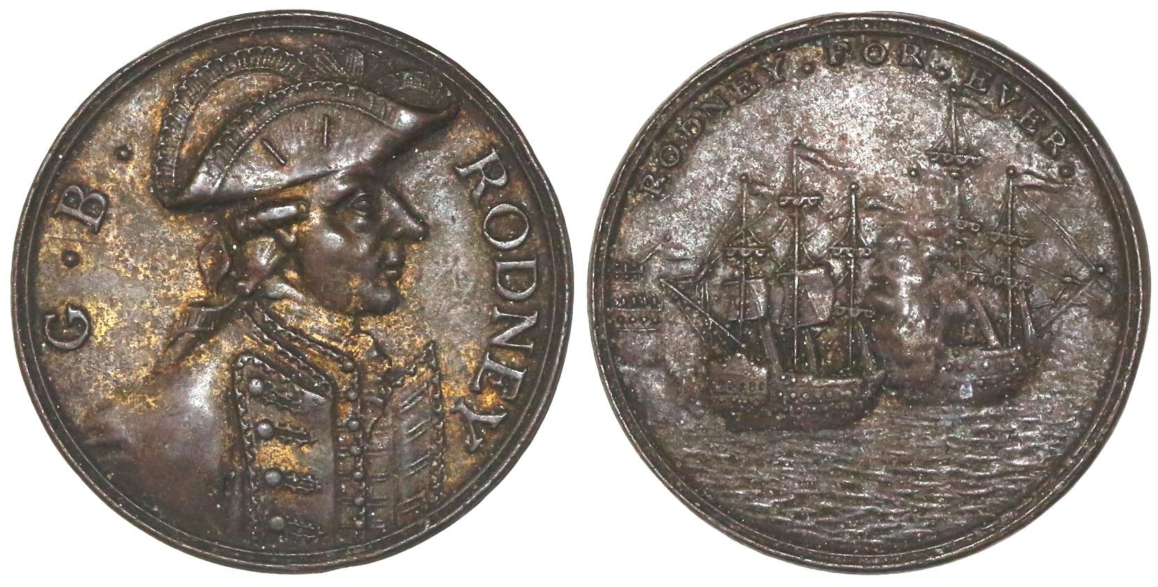 Great Britain, copper-alloy medal, 1781, Admiral Rodney's capture of St. Eustatius. 12.36 grams; 33 mm. Obverse: bust of British Admiral Rodney wearing tricorn and uniform facing right, G.B. RODNEY flanking; reverse: two warships in battle with castle at left, RODNEY . FOR . EVER. above. A very popular medal with a well-executed design commemorating Admiral Rodney's capture of St. Eustatius in 1781. Saint Eustatius, controlled by the Dutch at the time, was a vital trading and support area for Americans during the Revolutionary War and one of the first entities to recognize the United States in 1776. Choice AU with some brass color and luster on obverse, mostly toned chocolate brown, no problems.
