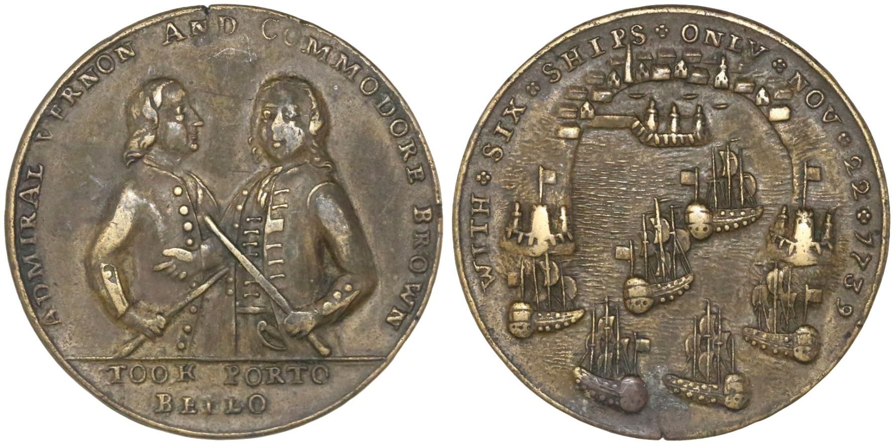 Great Britain, copper-alloy medal, Admiral Vernon, 1739, Porto Bello / Commodore Brown. AC-PBvb5I. 15.41 grams; 38 mm. Choice XF with dull brass color, a few old scratches in obverse field (now toned over), good strike with bold details.