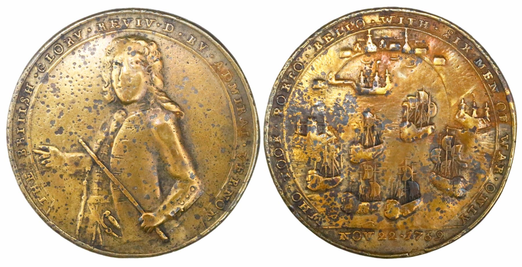 Great Britain, copper-alloy medal, Admiral Vernon, 1739, Porto Bello, three-quarters portrait, legend THE BRITISH GLORY REVIV D BY ADMIRAL VERNON, ex-Richard Stuart. AC-PBv36II. 16.36 grams. Polished VF with bright brassy color, minor pitting, well-executed design. Pedigreed to the Richard Stuart collection.