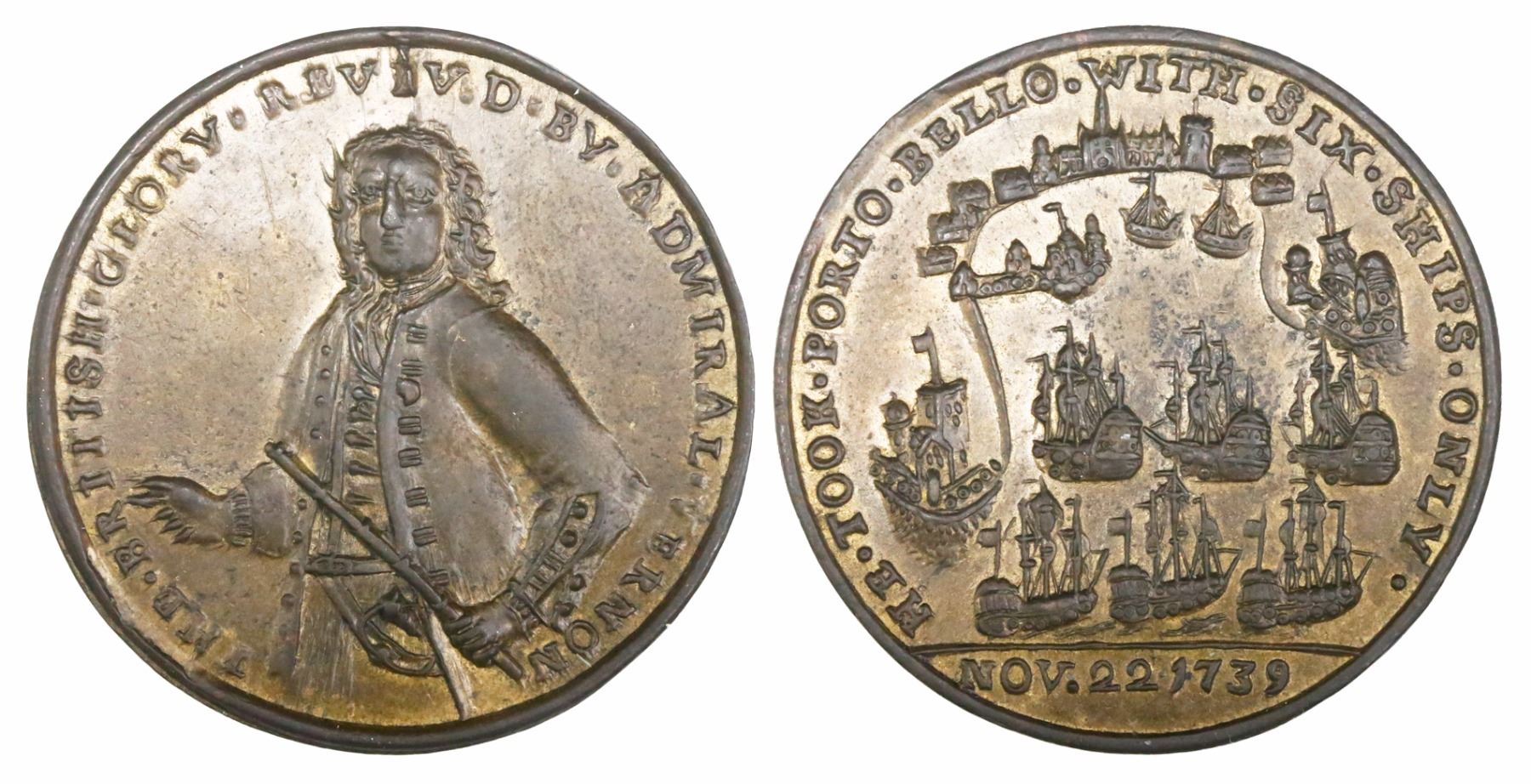Great Britain, copper-alloy medal, Admiral Vernon, 1739, Porto Bello, three-quarters portrait, legend THE BRITISH GLORY REVIV D BY ADMIRAL VERNON, ex-Richard Stuart. AC-PBv42RR. 13.80 grams. Very choice specimen, AU, somewhat prooflike with dark details against brighter brassy fields, no flaws to speak of. Pedigreed to the Richard Stuart collection.