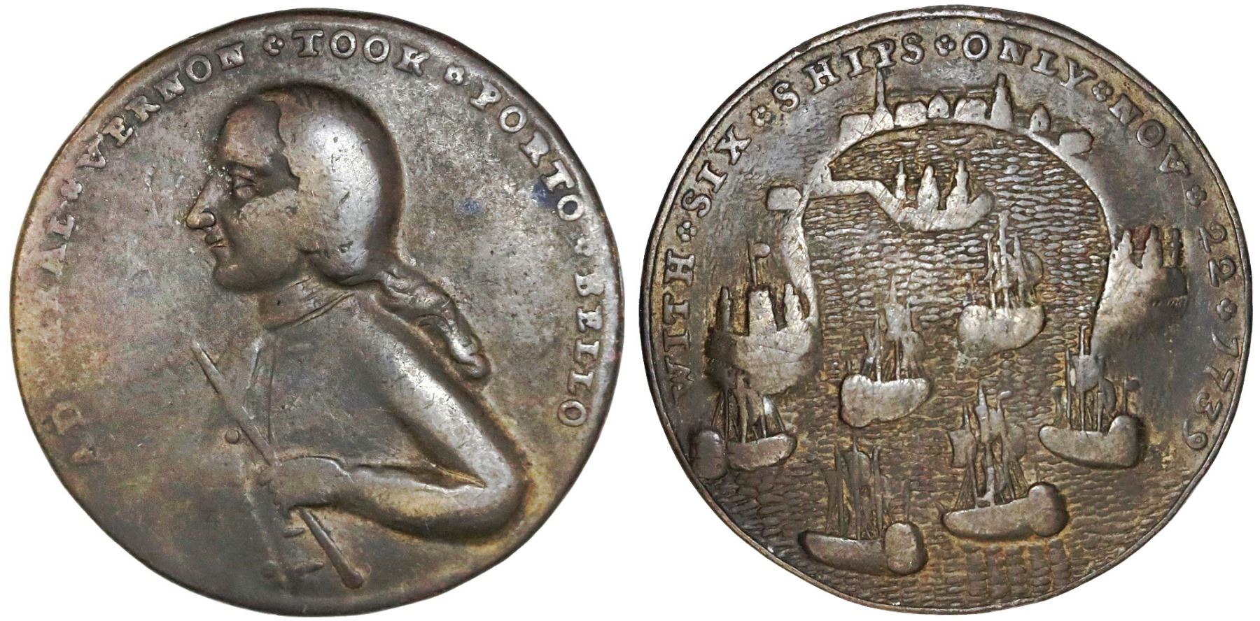 Great Britain, copper-alloy medal, Admiral Vernon, 1739, Porto Bello. AC-PBv18N. 21.40 grams; 37 mm. Fine, two dark spots and weak rims on obverse but otherwise no problems, rare, large type Vernon medal.